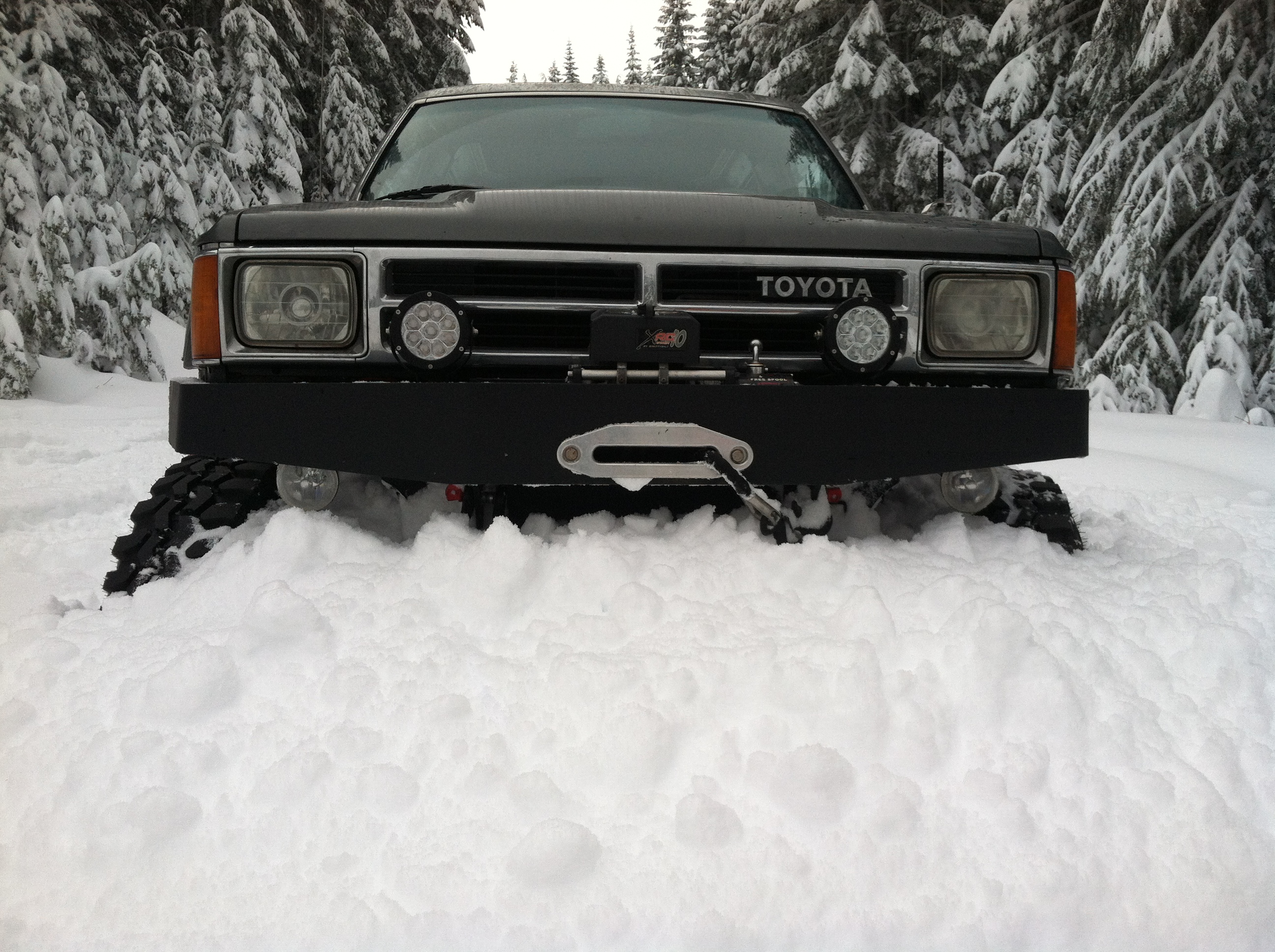 Awesome run today, I really wish we had been able to go farther but we were on a solo run and its just habit that i dont go too far up without another buddy rig, even though I can get myself out of just about any situation between my winch and one of my saws, still just nice to have someone else there. And there was all unbroken road just ahead of whee we had turned around but we were just driving through some snow cat tracks, no other trucks had been up so it was still really soft and powdery cause that snow cat hadn't compacted anything just cut a wide path on top of all the powder. So needless to say its crazy deep. About 4 feet of purely powder, just complete fluff it was awesome. I got those 10" wide wheels and didn't air down again today as I'm a little apprehensive to air down too far and have them debead, anyone know how far I can air down with those narrow tires without them wanting to walk off bead? Regardless it still does really well at full air pressure. Heres some pics !